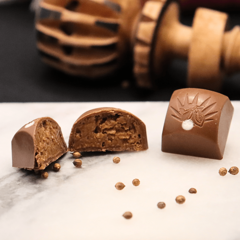 Pour son chocolat, Le Cacaoyer utilise des graines coriandre, qui offrent un goût plus doux, chaud et légèrement sucré avec des notes de noix et d’agrumes. Le petit plus ? L’intérieur chocolat crispy (croustillant).